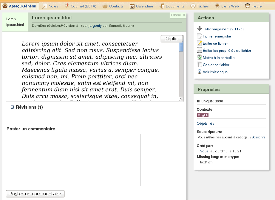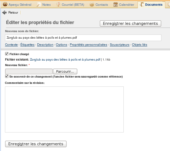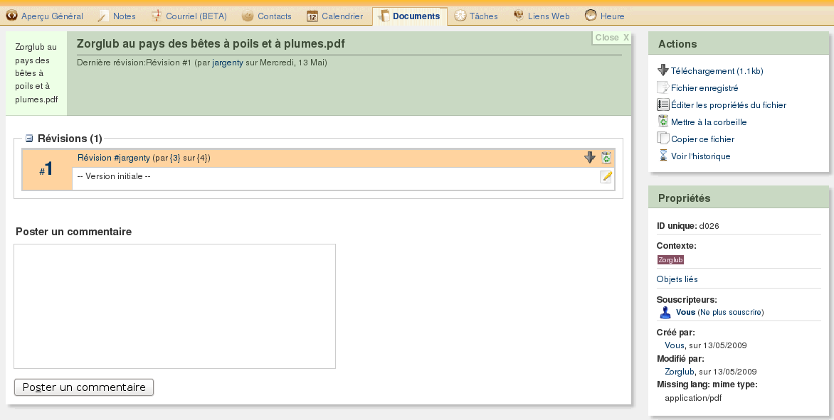 Comme dans tout outil de collaboration, vous pouvez télécharger des documents avec OpenGoo. Comme tout objet chaque document a ses propriétés que vous pouvez modifier. Maintenant que vous êtes familiarisés avec les concepts, la gestion des documents doit vous paraître simple.