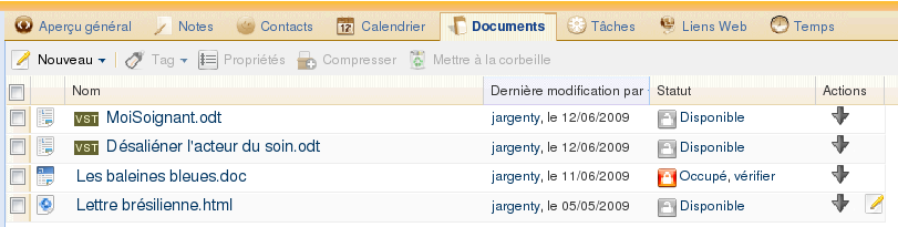Le moyen le plus facile pour comprendre le versioning est de créer une nouvelle version d'un document existant. Disons que nous aimerions faire un changement au document OpenOffice “Les baleines bleues.doc”. La première et plus importante étape consiste à déverrouiller le fichier en cliquant sur “disponible” dans l'indicateur d'état, qui va immédiatement être changé en “Occupé, Vérifier”: