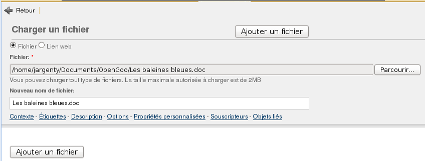 - Télécharger un fichier: Vous permet de télécharger un fichier de votre disque dur local à votre installation d'OpenGoo. Ce fichier peut être de tout type.
