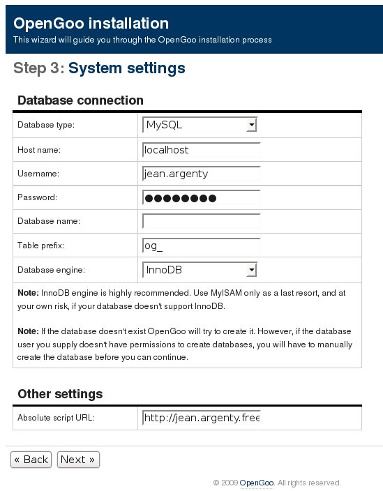 Dans cette étape 3 entrez les paramètres de la base de données où OpenGoo va stocker ses données. IMPORTANT: Si vous n'avez pas créé de base de données auparavant, vous devriez en créer une maintenant avec votre outils d'administration de base de données préférée, phpMyAdmin par ex. Pour l'instant l'installeur d'OpenGoo n'offre pas la possibilité de créer lui-même une base de donnée (les modalités sont variables selon les fournisseurs d'accés, note du trad.).
