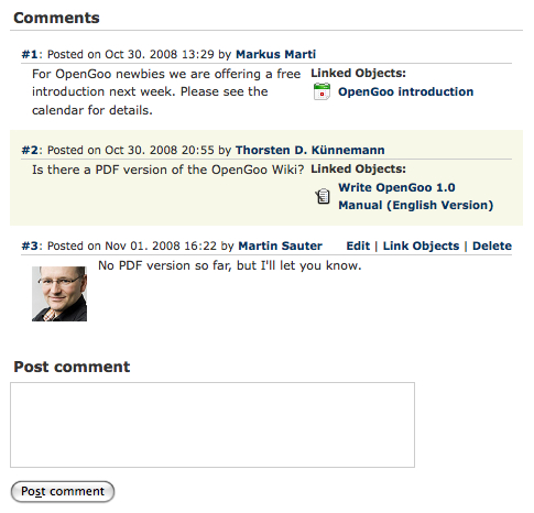 コメントの読み書きは詳細表示で行います。情報自身の下に、新しいコメントのフォームだけでなく既存のコメントも表示されます。
