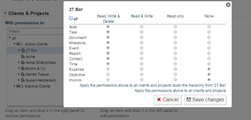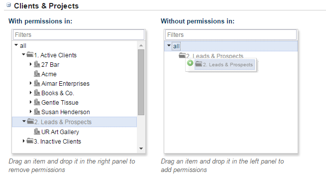 As you may see, you can drag and drop items in either the 'With permissions in:' or 'Without permissions in:' boxes, according to your preferences. Moreover, you can configure permissions inside each client, project, or folder by clicking on it.