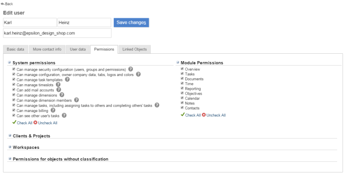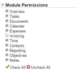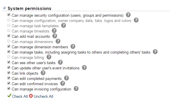 - Select the System Permissions, Module Permissions, Clients & Projects Permissions, and Workspaces Permissions for the members that this group will have (you can click on the green ? icon if you are not sure what the permission is for). This is done in the same way as for individual users (see the above section).