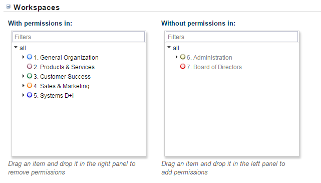 As you may see, you can drag and drop items in either the 'With permissions in:' or 'Without permissions in:' boxes, according to your preferences. Moreover, you can configure permissions inside each workspace by clicking on it.