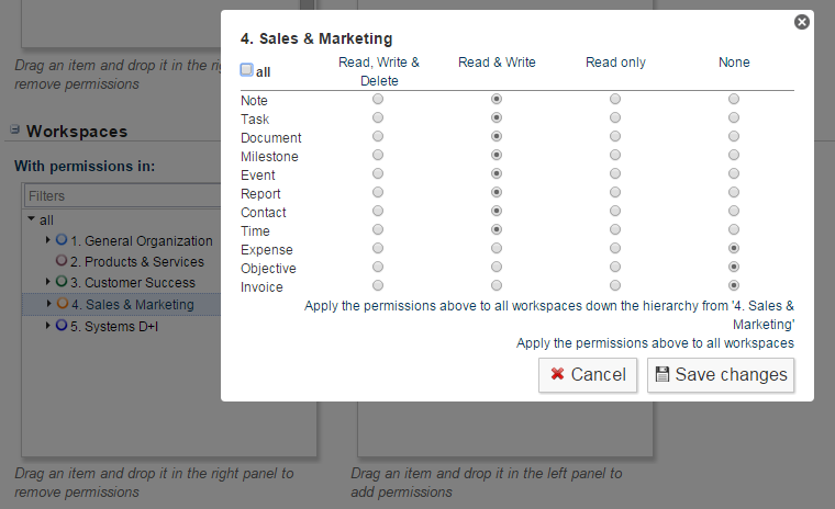 - If you would like a user to have permissions in a whole workspace (also within each workspace down its hierarchy), you may click on 'Apply the permissions above to all workspaces down the hierarchy from…' on the bottom right corner of the permissions menu.