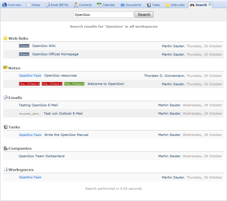 Searching always takes place in the currently selected Client, Project, Workspace, etc. This can help narrow your search. On the other hand, if you don't find what you expect, you may look for something Everywhere by standing on View all on your left.