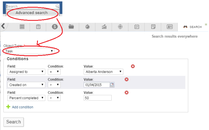 Some modules come with their own specific search box, which will look for objects inside the module from where you are performing the search. These search boxes can be found in the module´s toolbar.