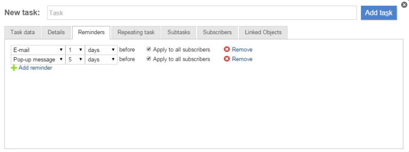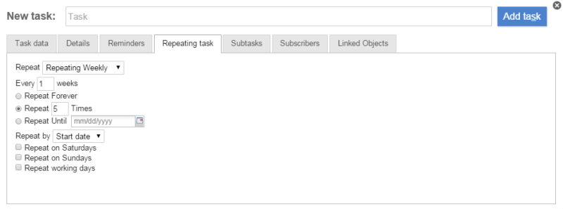 This Day Only. * Every … weeks: This defines the interval between two occurrences of the task. * Repeat forever: This allows you to repeat the task with no time limitation. * Repeat … times: This option allows you to set up exactly how many times you want the repetition to be done (if you did not choose Repeat Forever). * Repeat until…: Use this option to set up a date by which the repetition will no longer occur. (i.e., if you are planning a weekly task like “Writing status report” for a project, which must be completed at the end of the year, you may want to set up: Repeat until: December 31st) * Repeat by: Define whether you wish to repeat by the Start date or Due Date of the Task. * You can also set repetition to: Repeat on Saturdays, Repeat on Sundays, Repeat on Working Days ==== Section “Reminders” ==== As a way of keeping up with tasks' Due Dates and making sure that they are completed on time, you can set up reminders such as Email Notifications or Pop-Up Messages. (This is very similar to defining reminders for events.)