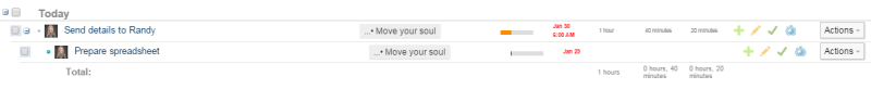 - Stopwatch icon: Starts the time tracking for a task. If there is a user working on a task, a counter is shown, and you get buttons to pause or stop the time tracking.