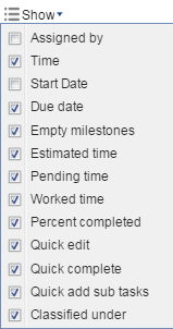 - Show: Shows further information such as Time, Dates, Empty Milestones, or Estimated Task Time.