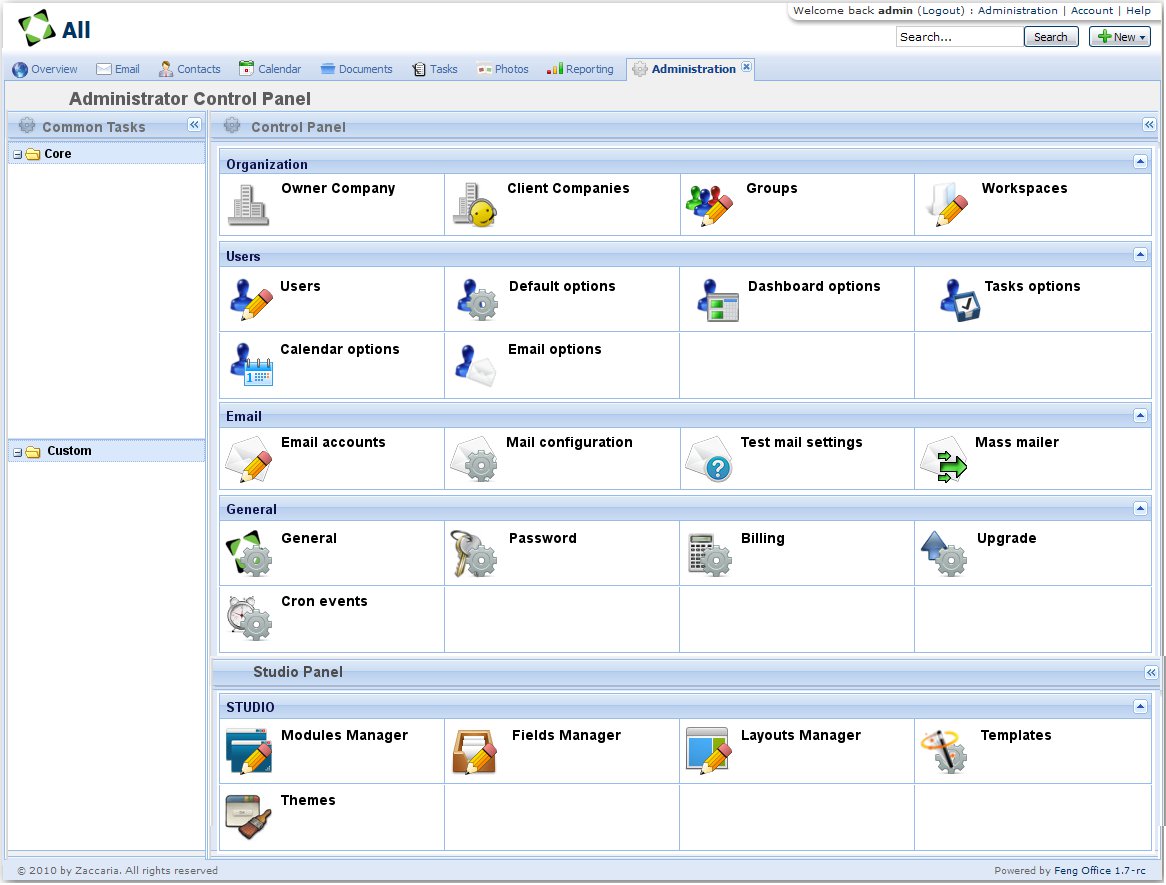 EVX Software STUDIO is a collection of tools to allow the user to customize fengOffice and build new applications within the fengOffice framework. We will look at 4 major aspects of custom alterations of EVX Software: