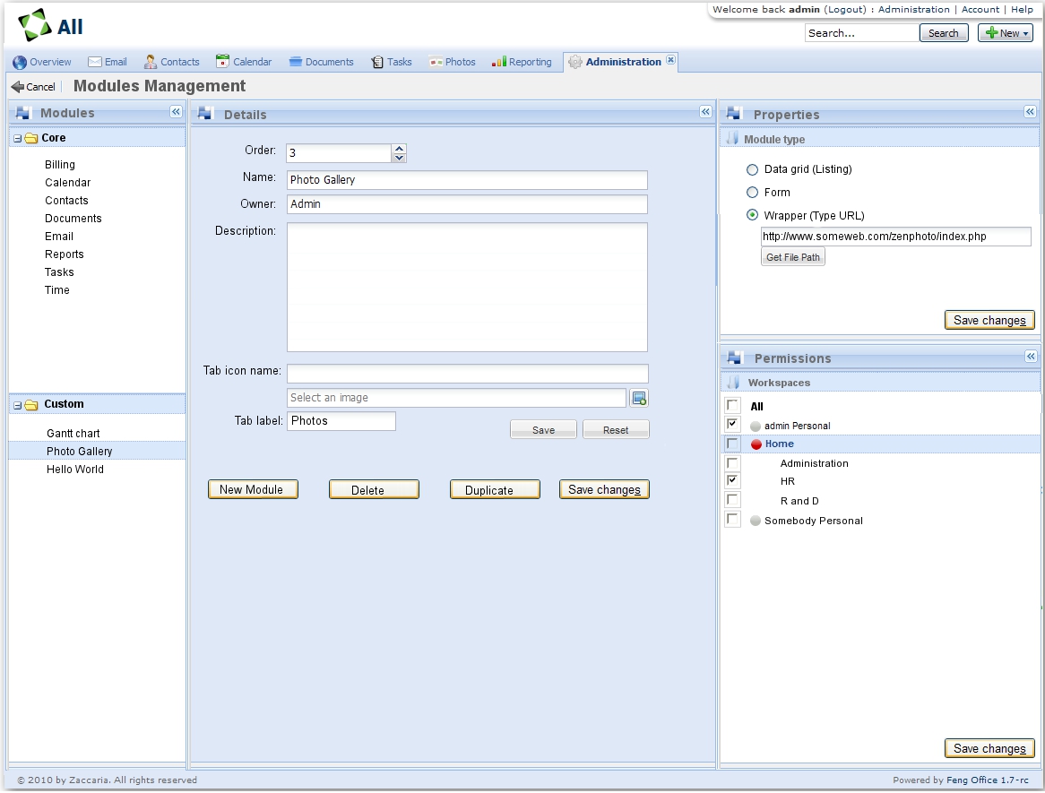 - The Permissions component is set to All by default, meaning that everyone having access to ANY of the workspaces can see this module. The administrator can change those permissions, thus controlling who can see which module.