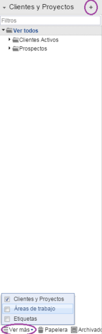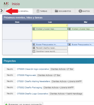Para agregar proyectos (o áreas de trabajo, carpetas, clientes, etc.), debe habilitar el panel de navegación (si todavía no se encuentra habilitado), haciendo clic en la flecha pequeña que se muestra abajo: