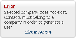 If you get the following error message, your contact has no company assigned (which is mandatory for users). Simply edit the contact and add a company to solve this issue.