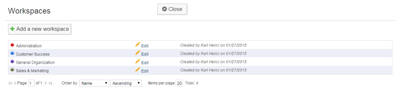 There are two ways you can edit the workspace properties. The most common way is to select a workspace in the left sidebar and then click on the edit icon next to it: